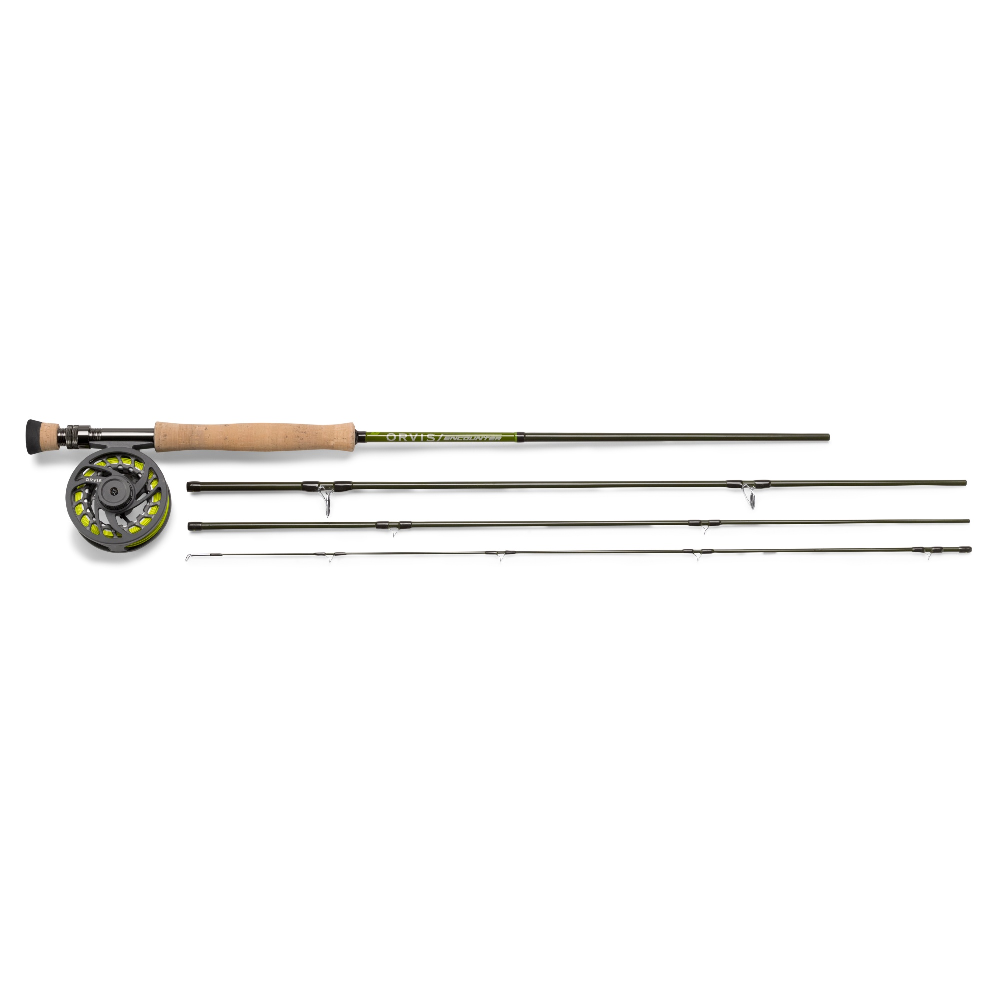 Orvis Encounter 908-4 Outfit. Komplett flugfiskeset med Encounter 4-delat grafitspö i kombination med Encounter storspolerulle, fluglina och backing. Levereras i skyddande tub av cordura. Längd 9', 270cm. Linklass 8.