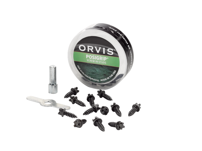 Orvis Posigrip Screw-In Studs. Lösa dubbar som enkelt kan skruvas in i sulan på vadarskorna, ger extra bra halkskydd. Adapter för skruvdragare medföljer i förpackningen. 24 styck per förpackning.